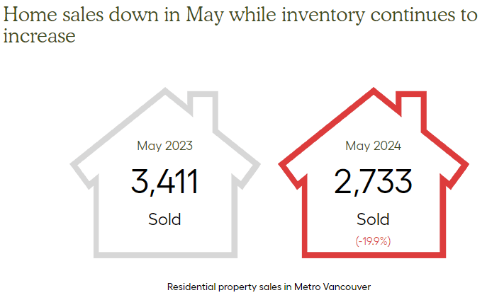 The Greater Vancouver REALTORS® (GVR)2 reports that residential sales in the region totalled 2,733 in May 2024, a 19.9 per cent decrease from the 3,411 sales recorded in May 2023. Last month’s sales total was also down 19.6 per cent from the 10-year seasonal average for May (3,398).