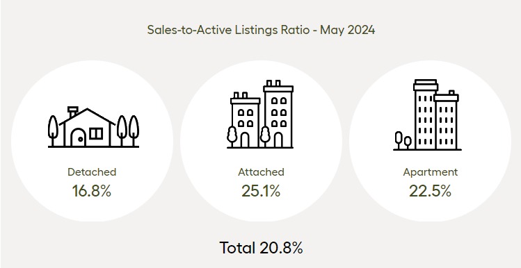 Across all detached, attached and apartment property types, the sales-to-active listings ratio for May 2024 is 20.8 per cent. By property type, the ratio is 16.8 per cent for detached homes, 25.1 per cent for attached, and 22.5 per cent for apartment properties.