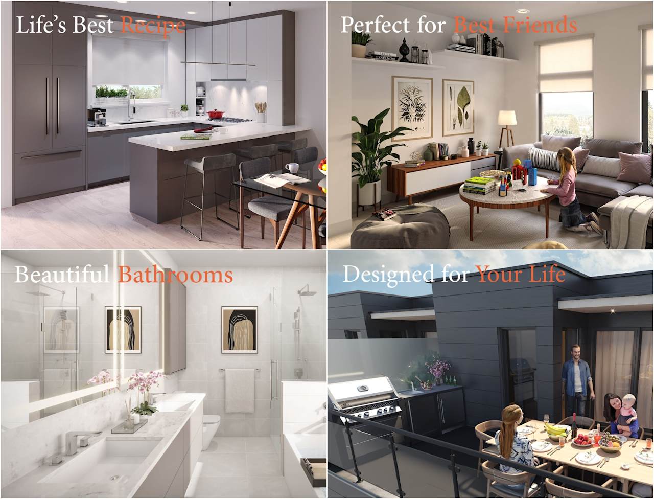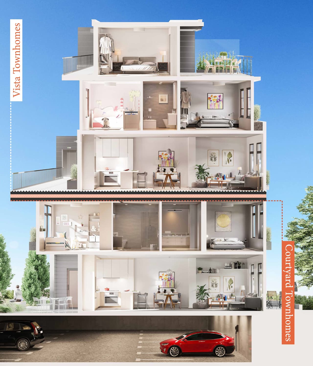 Welcoming you home through a vibrant community courtyard. With private terraces and views of the North Shore and beyond
