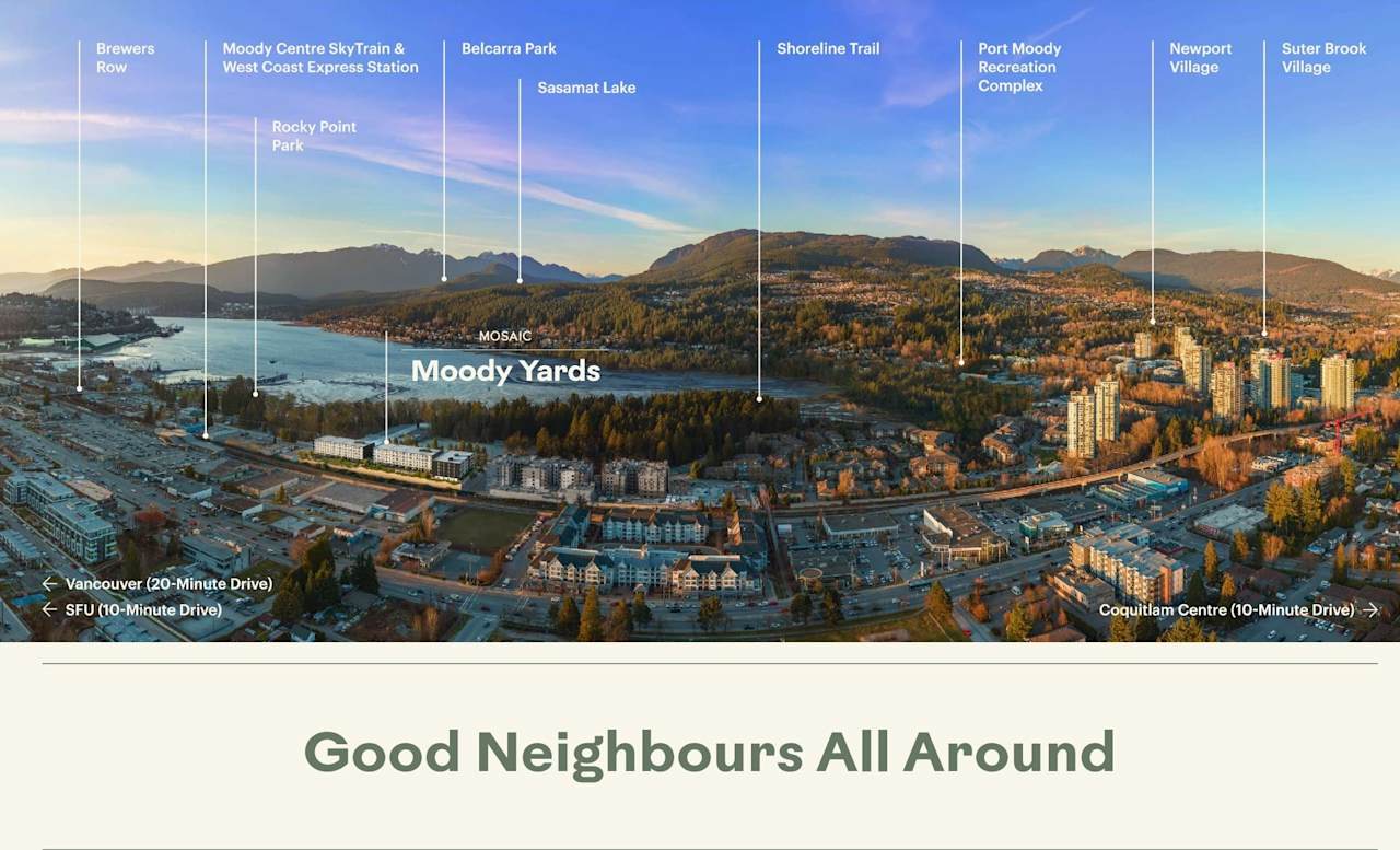Standing at the end of an inlet on the edge of a park, Moody Yards is surrounded by a bunch of great neighbours. Connected regionally by Moody Centre SkyTrain a short walk away. Connected locally by the Shoreline Trail across the street. And then there’s Brewers Row a block down the way. A new Murray high street destination in Port Moody is in the making with everything you need nearby.